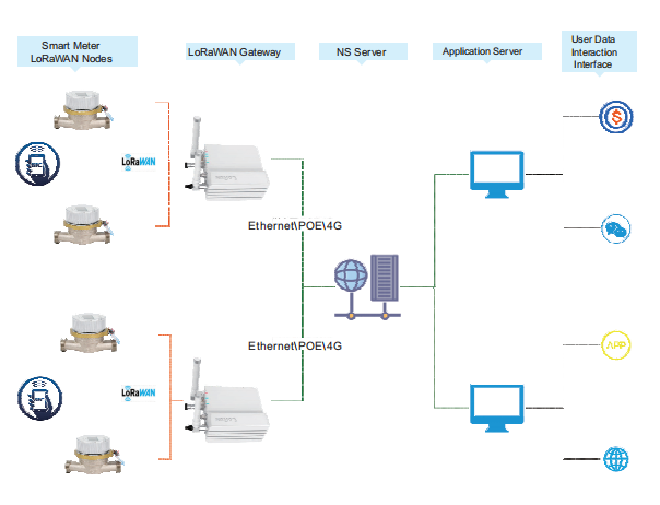 智能水表基于LoRaWAN协议网络架构,具有成本低、传输距离远、抗干扰能力强等优势。具有高灵敏度和低功耗的特点。借助物联网、云计算、大数据等技术,大规模的水资源相关信息将被及时收集、分析和处理,以保障供水企业为提升运营与管理效率,实现对整个生产流程的全面管控以更精细化、动态化的方式管理和服务水系统,实现水务企业的内部管理与外部服务创新,从而达成智能管理与决策。云计算等新技术已得到广泛应用,基于LoRaWAN协议的网络架构技术将使智能水务成为信息水平的标志之一。