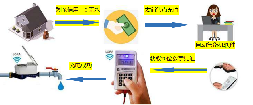 按键式预付费水表是一种符合STS(标准传输规范)的电子阀门受控水表。RF STS预付费水表系统由智能水表和独立键盘组成,该键盘被定义为 UIU(用户接口单元。STS(标准传输规范)预付费水表系统,用户可通过第三方支付系统获取20位充值令牌,再通过 UIU(用户界面单元)输入该令牌完成充值及水表查询。